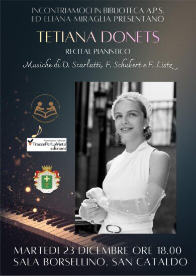 Con il patrocinio gratuito del Comune di San Cataldo e di TraccePerLaMeta, Gianfranco Cammarata, Presidente dell’Associazione Incontriamoci in Biblioteca, comunica che San Cataldo si prepara ad accogliere un evento musicale di respiro internazionale. Martedì 23 dicembre alle ore 18.00, alla Sala Borsellino, la pianista Tetiana Donets sarà protagonista di un recital pianistico di un’ora, ospite del Comune per un appuntamento unico nel panorama culturale cittadino.