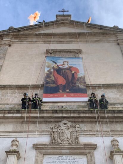Al termine della funzione religiosa, si è vissuto uno dei momenti più suggestivi della giornata: una squadra dei Vigili del Fuoco ha raggiunto con l’autoscala la facciata della Cattedrale per collocare il grande telo raffigurante Santa Barbara e deporre una corona di fiori, quale segno di devozione e gratitudine. Durante lo srotolamento del telo sulla facciata, l’intera scena è stata arricchita dall’accensione di fumogeni arancioni, che hanno creato un effetto visivo di forte impatto emotivo, rendendo il gesto ancora più solenne e scenografico.