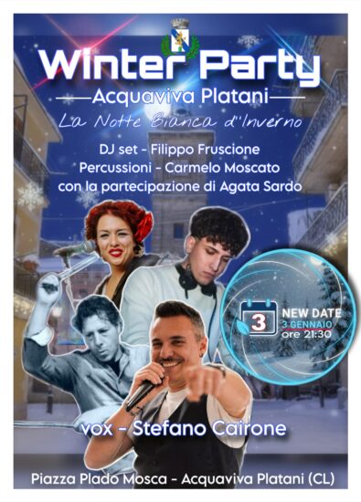 ACQUAVIVA PLATANI – Nonostante le piccole dimensioni della comunità acquavivese, anche quando il periodo natalizio lentamente volge al termine, si respira ancora, atmosfera di comunità, tradizioni religiose e iniziative sociali, sempre organizzate con il coinvolgimento di associazioni e cittadini. Infatti, ancora due appuntamenti ludico-ricreativi sono in programma: il primo per domani sera, sabato 3 gennaio 2026, la notte bianca…. d’inverno . Un intrattenimento che si terrà alle 21,30 in Piazza Plado Mosca con Dj Set Filippo Fruscione, percussioni Carmelo Moscato con la partecipazione di Agata Sardo. Lunedì prossimo 5 gennaio, invece, con inizio alle 20,30 – presso il centro socio culturale è prevista una serata all’insegna di musica, cabaret e tombolata con ricchi premi a conclusione delle festività natalizie.