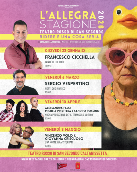 Caltanissetta – Tutto pronto per l’inizio de “L’Allegra Stagione”, la rassegna di teatro comico che da oggi , giovedì 22 gennaio 2026, porterà sul palco del Teatro Rosso di San Secondo quattro appuntamenti all’insegna del sorriso, della qualità artistica e della comicità contemporanea.