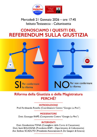 Il Centro di Presenza “Giorgio La Pira” di Caltanissetta, espressione territoriale del partito Insieme Lavoro e Famiglia – Solidarietà e Pace, rende noto che, il 21 gennaio, alle ore 17:45, presso l’Istituto Testasecca di Caltanissetta, si terrà un evento dal titolo “Conosciamo i quesiti del Referendum sulla giustizia”. Interverranno, per i loro diversi ruoli nel campo potere giudiziario il Dott. Giambattista Tona (Consigliere della Corte di Cassazione), il Dott. Santi Bologna (Presidente ANM del Dipartimento di Caltanissetta), l’Avv. Stefano Scaduto (Presidente dell’Associazione Alcide De Gasperi di Sciacca). Modererà gli interventi il Dott. Giuseppe Rapè (Componente del Centro di Presenza “Giorgio La Pira”); curerà la presentazione dell’evento il Prof. Ferdinando rovello ( Coordinatore del Centro di Presenza “Giorgio La Pira”. Sarà dato ampio spazio agli interventi di quanti vorranno partecipare.