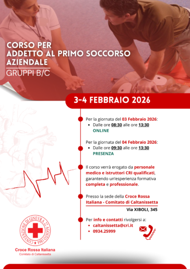 CALTANISSETTA. Si svolgerà nella date del 5 e 6 febbraio 2025 in modalità mista tra On Line e presenza per le parti pratiche presso il Comitato della Croce Rossa Italiana di Caltanissetta ODV di sito in Via Xiboli, 345 un Corso di Primo Soccorso Aziendale 81/08 e DM 388, per le aziende cat. B/C, per la popolazione e le scuole che consentono ai lavoratori incaricati di svolgere nei luoghi di lavoro, la mansione di Addetto al Primo Soccorso Aziendale ai sensi del D.Lgs. 81/08 e DM 388/03.