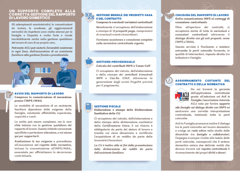 I servizi proposti in merito dal Patronato ACLI di Caltanissetta sono: elaborazione di preventivi per avviare un’assunzione; avvio del rapporto di lavoro; gestione contabile mensile del contratto (elaborazione dei cedolini paga e dei bollettini PagoPa per il versamento degli oneri contributivi); la gestione previdenziale e fiscale (con il supporto e la cooperazione dei consulenti del Caf ACLI); la chiusura del rapporto di lavoro; l’aggiornamento costante di tutti gli adempimenti previsti dalla normativa di settore. La garanzia dell’applicazione contrattuale avviene grazie all’adesione del Patronato ACLI ad ACLI IN FAMIGLIA, l’associazione datoriale delle ACLI nata per fornire supporto alle famiglie nel dialogo diretto con l’INPS ed assicurare una corretta interpretazione contrattuale, tutelando tutte le parti coinvolte: datore di lavoro e lavoratori.