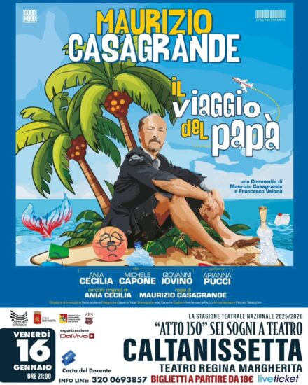 Caltanissetta – Dopo l’ottimo riscontro di pubblico e critica registrato nei primi due appuntamenti della Rassegna Teatrale Nazionale “Atto 150 – Sei sogni a teatro”, il Teatro Regina Margherita di Caltanissetta si prepara ad accogliere il terzo spettacolo in cartellone: Il viaggio del papà, scritto e interpretato da Maurizio Casagrande, in scena insieme a Ania Cecilia, Michele Capone, Giovanni Iovino e Arianna Pucci.