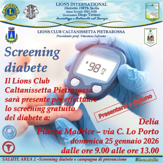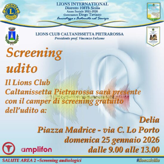DELIA. Domenica 25 gennaio 2026, a partire dalle ore 9.00 e sino alle ore 13.00, il Lions Club Caltanissetta Pietrarossa sarà presente nel Comune di Delia per effettuare gli screening gratuiti di udito e diabete.