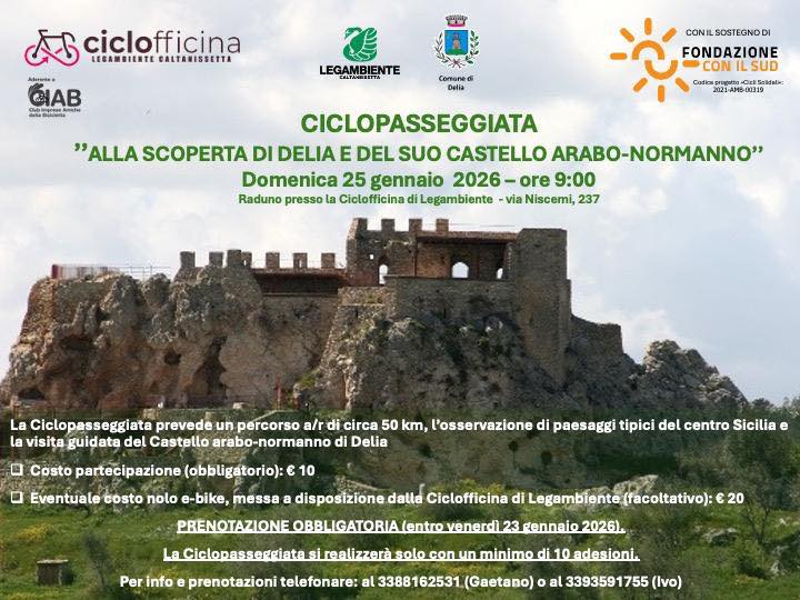 DELIA. Domenica 25 gennaio 2026 sarà realizzata la Ciclopasseggiata “Alla scoperta di Delia e del suo Castello arabo-normanno”, con partenza da Caltanissetta, la realizzazione di un percorso a/r di circa 50 km e l’attraversamento di alcuni paesaggi tipici dell’entroterra siciliano.