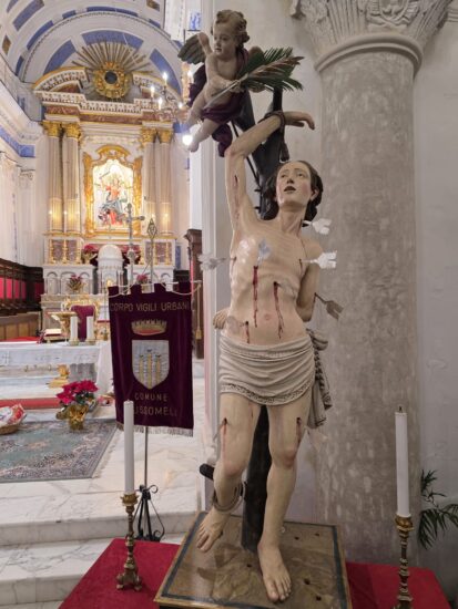 MUSSOMELI – Un appuntamento sentito e atteso dal Corpo della Polizia Municipale di Mussomeli è stato quello della ricorrenza liturgica di San Sebastiano, santo martire venerato nella Chiesa Madre e tradizionalmente riconosciuto come patrono dei Vigili Urbani. Anche se celebrata con un giorno di ritardo rispetto alla data canonica, la Santa Messa ha visto una partecipazione significativa delle autorità civili e militari, dei vigili urbani in servizio e di quelli in pensione, a testimonianza di un legame profondo tra il Santo e la comunità locale. La celebrazione eucaristica è stata presieduta dall’arciprete Padre Achille Lomanto, che durante l’omelia ha presentato la figura di San Sebastiano, giovane soldato romano e martire cristiano, esempio di fede, coraggio e servizio al prossimo. Un modello che richiama da vicino i valori di dedizione, senso del dovere e sacrificio propri di chi opera quotidianamente per la sicurezza e il bene comune. Presente alla funzione il vicesindaco Seby Lo Conte, in rappresentanza dell’amministrazione comunale, mentre il sindaco Giuseppe Catania era assente per impegni istituzionali fuori sede. La ricorrenza si è confermata, ancora una volta, non solo come momento di preghiera, ma anche come occasione di riflessione e di coesione per l’intera comunità mussomelese, nel segno della tradizione e della devozione a San Sebastiano. Al termine un momento di fraternità.