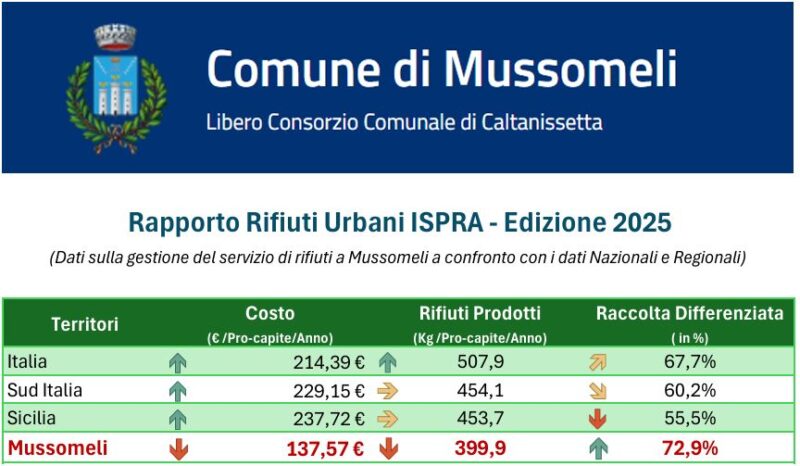 Un valore significativamente inferiore alle medie: – Sicilia: 453,66 kg; – Sud Italia: 454,07 kg: – Italia: 507,90 kg. “Questi risultati – dichiara il Sindaco di Mussomeli, On. Giuseppe Catania– dimostrano come la sensibilizzazione ambientale, le buone pratiche quotidiane e la collaborazione costante tra istituzioni e cittadini possano tradursi in benefici concreti per l’ambiente e per l’intera collettività. Non si tratta di un punto di arrivo, ma di uno stimolo a migliorare ulteriormente, investendo sul futuro delle nuove generazioni”. L’Amministrazione comunale rivolge un sentito ringraziamento a tutti i cittadini di Mussomeli, il cui senso civico e la cui collaborazione sono stati determinanti per il raggiungimento di questi importanti obiettivi. Il rapporto completo è consultabile sul sito ISPRA al seguente link: https://www.isprambiente.gov.it/it/istituto-informa/comunicati-stampa/anno-2025/rifiuti-urbani-nel-2024