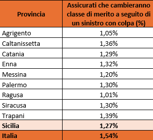 Guardando i dati a livello territoriale emerge che le province emiliano-romagnole che hanno registrato, in percentuale, il maggior numero di denunce di incidenti con colpa e quindi saranno più colpite dagli aumenti sono Trapani, Caltanissetta ed Enna.