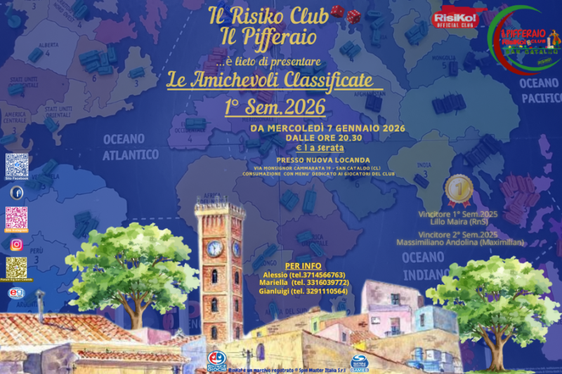 Per ogni informazione sulle attività del Risiko Club Ufficiale “Il Pifferaio”, e per la partecipazione ai vari eventi di gioco e ai vari Tornei organizzati dal Club già da questo mese di Gennaio 2026, ci si potrà rivolgere ai referenti del Club Alessio Sansoni (tel.371/4566763), Mariella Brucculeri (tel. 331/6039772) e Gianluigi Orlando (tel 3291110564). Ci si può tenere informati anche attraverso le pagine social del Club sulle piattaforme Facebook e Instagram (basta digitare il nome del Club), e sul nuovo Canale Youtube @RisikoClubUfficialeIlPifferaio, nelle quali saranno pubblicati i vari regolamenti dei Tornei e tutte le foto, i video, le classifiche, e i resoconti dei vari eventi che via via sono organizzati.