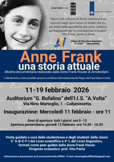 Rivolta a un pubblico di ogni età, l’esposizione rappresenta per l’IIS “A. Volta” e per l’intera città di Caltanissetta un’importante occasione educativa e formativa, in linea con l’impegno della scuola nella promozione dei valori della tolleranza, del rispetto reciproco e della cittadinanza attiva. Attraverso questo progetto, l’istituto intende offrire a studenti, docenti e alla cittadinanza uno strumento di conoscenza e consapevolezza, capace di collegare la memoria storica alle sfide del mondo contemporaneo e alla lotta contro il razzismo e la xenofobia. L’aspetto più innovativo e qualificante di questo allestimento risiede nel ruolo centrale affidato agli studenti. Le visite guidate saranno infatti curate dagli alunni delle classi 5ª A-B-E-F-I del Liceo Scientifico e della 4ª L del Liceo Linguistico dell’IIS “A. Volta” di Caltanissetta, guidato dal Dirigente Scolastico Prof. Vito Parisi. Inserito in un percorso di eccellenza per la formazione di peer guides esperte, il gruppo di studenti ha affrontato un percorso di alta formazione in lingua inglese presso il Liceo “Galilei” di Catania. L’attività è stata condotta da un team di esperti della Anne Frank House di Amsterdam, con il prezioso supporto dell’Ambasciata del Regno dei Paesi Bassi. Il coordinamento didattico, affidato ad Aaron Peterer (referente della Anne Frank House), si è avvalso della collaborazione di Roberta Gibertoni (Studio Pro Forma Memoria, referente italiana per la Fondazione), Federica Pannocchia (Associazione “Un Ponte per Anne Frank”) e Delia Cunsolo (Anne Frank Youth Network). Il progetto è stato reso possibile grazie alla attività organizzativa delle docenti referenti: Laura Cumbo, Assunta Gallo Afflitto, Enza La Piana, Giuseppina Liotta, Rosanna Nola, Romina Restivo e Pina Volpe.