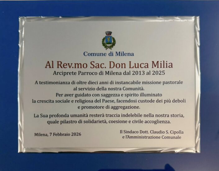 MILENA – Ieri, la Comunità di Milena ha voluto dire grazie a don Luca Milia, conferendogli la Cittadinanza Onoraria, suggello pubblico di un’appartenenza che era già scritta nei cuori. Nella targa, voluta dal Sindaco dott. Cipolla e dall’intero Consiglio Comunale, è incisa la memoria di oltre dieci anni di instancabile missione pastorale, vissuta dal 2013 al 2025 al servizio del Paese di Milena. Così recita la targa consegnatagli: ”Una guida saggia e illuminata, custode dei più deboli, promotore di aggregazione, testimone di umanità profonda e concreta. Una traccia indelebile nella storia di Milena, fatta di solidarietà, coesione e civile accoglienza”, recita la targa. Dopo la cerimonia laica, presso la sala “Falcone-Borsellino”, è seguita alla Chiesa Madre la celebrazione eucaristica presieduta da padre Luca Milia che ha reso ancora più forte questo sentimento di ringraziamento, in un clima di raccoglimento e di emozioni. Dieci anni di servizio pastorale a Milena. I sacerdoti sono chiamati all’obbedienza, ad andare dove il Vescovo li invia. Ma dopo tanti anni accade qualcosa di più grande: una parrocchia diventa casa, una comunità diventa famiglia. E così, quando un sacerdote ritorna a celebrare nella “sua casa”, è come un familiare che, lavorando lontano, rientra per un saluto: con lo stesso affetto, con la stessa emozione. Un sentimento che non toglie nulla al presente, né a chi oggi guida con dedizione la comunità, ma che si aggiunge come memoria buona, come riconoscenza per un cammino condiviso, nel rispetto dei ruoli e nella continuità della vita pastorale. “Che tu fossi ormai un milocchese caro don Luca – è stato detto – questo era certo: adesso, però, c’è anche il suggello ufficiale. Auguri, don Luca. Milena è – e resterà – casa tua”.