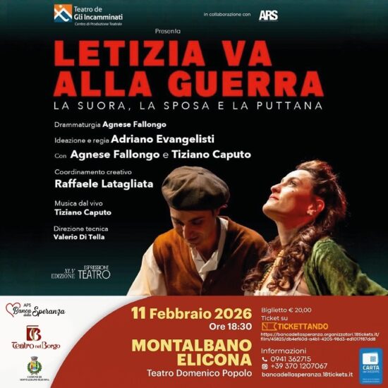 Proseguirà l’11 febbraio 2026, alle ore 18.30, al teatro “Domenico Popolo” di Montalbano Elicona, la rassegna “Il Teatro nel Borgo”, organizzata dalla “Banca della Speranza”. Il secondo spettacolo del 2026, ed il sesto per la stagione teatrale 2025/26, è “Letizia va alla guerra, la suora, la sposa e la puttana” di Agnese Fallongo, una produzione “Teatro de Gli Incamminati” con Agnese Fallongo e Tiziano Caputo. “Letizia va alla guerra” è un racconto tragicomico di tenerezza e verità. Tre grandi donne, due guerre mondiali, un sottile fil rouge ad unirle: uno stesso nome, un unico destino. Tre donne del popolo, che, irrimediabilmente travolte dalla guerra nel loro quotidiano, si ritroveranno a sconvolgere le proprie vite e a compiere piccoli grandi atti di coraggio in nome dell’amore. Tre provenienze regionali differenti: nord, sud e centro Italia – Veneto, Sicilia e Lazio. Tre età differenti: una fanciulla, una donna e un’anziana.