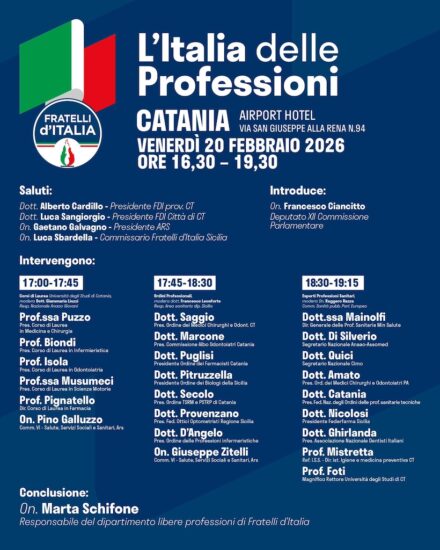 Si terrà venerdì 20 febbraio, alle ore 16.30, all’Airport Hotel di Catania, il convegno dal titolo ‘L’Italia delle Professioni’, promosso dal Dipartimento Libere professioni di Fratelli d’Italia, diretto dall’on. Marta Schifone, insieme ai coordinamenti regionale e provinciale di FdI Catania. L’iniziativa nasce per riaffermare la centralità del mondo delle libere professioni nel sistema economico e sociale italiano e per favorire un confronto diretto tra istituzioni, ordini professionali, università e rappresentanze di categoria. Un momento di dialogo e approfondimento sulle principali sfide che interessano il settore: tutele, accesso alle professioni, semplificazione burocratica, valorizzazione delle competenze e difesa del modello professionale italiano. Nel corso dell’incontro verranno richiamate anche le riforme avviate dal Governo guidato da Giorgia Meloni a sostegno delle libere professioni, un quadro di riferimento che farà da sfondo al dibattito, ma che lascerà spazio soprattutto all’analisi e al contributo dei protagonisti del mondo professionale. Dopo i saluti istituzionali di Alberto Cardillo, presidente provinciale FdI Catania, di Luca Sangiorgio, presidente FdI Catania, dell’on. Gaetano Galvagno, presidente dell’Assemblea Regionale Siciliana, dell’on. Luca Sbardella, commissario regionale FdI Sicilia, e di Enrico Trantino, sindaco di Catania, introdurrà i lavori l’on. Francesco Ciancitto, componente della XII Commissione parlamentare. Il convegno si articolerà in tre distinti panel tematici, dedicati ai diversi ambiti delle professioni, con il coinvolgimento di accademici, rappresentanti degli ordini, dirigenti sanitari e parlamentari.