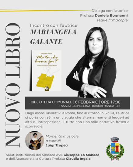 Domani la Biblioteca comunale di Barrafranca ospiterà l’incontro con l’autrice Mariangela Galante, in programma alle ore 17.30 nei locali di piazza Fratelli Messina.