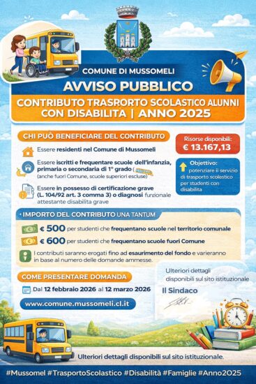 MUSSOMELI -Il Comune di Mussomeli comunica che è aperto l’avviso pubblico per la concessione di contributi economici alle famiglie con figli minori con disabilità, frequentanti scuola dell’infanzia, primaria e secondaria di primo grado, anche in Comune diverso da quello di residenza, per sostenere le spese di trasporto scolastico. L’importo del contributo è pari a € 500 per studenti che frequentano scuole nel Comune di Mussomeli; € 600 per studenti che frequentano scuole in altro Comune. I requisiti principali sono:Residenza nel Comune di Mussomeli; Mancato utilizzo del servizio di trasporto pubblico locale; Iscrizione e frequenza alla scuola dell’infanzia, primaria (elementari) o secondaria di 1° grado (media); Certificazione di handicap ai sensi della L. 104/92 art.3 c.3 o diagnosi funzionale valida; Servizio di trasporto organizzato autonomamente dalla famiglia. Per presentare la domanda, utilizzare il modulo disponibile sul link https://www.comune.mussomeli.cl.it/…/novita_326.html. I termi della domanda decorrono dal 12/02/2026 al 12/03/2026