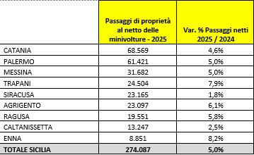 Nel 2025, secondo l’elaborazione di AutoScout24 su dati ACI, Catania si conferma la prima provincia della Sicilia per numero di passaggi di proprietà netti, con 68.569 atti, in crescita del 4,6% rispetto al 2024. Seguono Palermo con 61.421 passaggi (+5,0%) e Messina con 31.682 atti, anch’essa in aumento del 5,0%. Prosegue la graduatoria Trapani con 24.504 passaggi, distinguendosi per una crescita particolarmente sostenuta (+7,9%), seguita da Siracusa con 23.165 atti (+1,8%) e Agrigento con 23.097 (+6,1%). Ragusa registra 19.551 passaggi (+5,8%), mentre Caltanissetta si attesta a 13.247 atti (+2,5%). Enna chiude la graduatoria regionale con 8.851 passaggi, risultando la provincia più dinamica della Sicilia grazie a una crescita dell’8,2%.