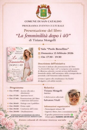 In questa occasione avverrà la presentazione del libro “La Femminilità dopo i 40” di Tiziana Mongelli, con collaboratore editoriale: Salvatore Vitali. Ad organizzare l’evento è il Comune di San Cataldo. L’ingresso è libero; è gradita la prenotazione tramite WhatsApp al 328 978 4866 nel contesto di un evento che è un’occasione per ascoltare, condividere e sentirsi parte di una comunità che cresce insieme.