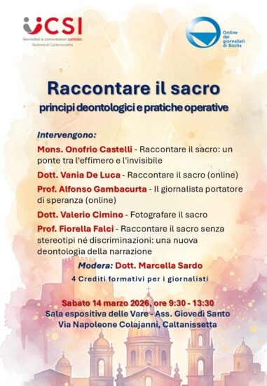 Un momento di approfondimento dedicato al rapporto tra informazione, etica e dimensione religiosa. È questo l’obiettivo del corso di formazione promosso dall’Ucsi Caltanissetta, presieduta da Valerio Cimino, dal titolo “Raccontare il sacro: principi deontologici e pratiche operative”, aperto non solo ai giornalisti ma a tutti coloro che desiderano comprendere le dinamiche della narrazione del sacro nei media contemporanei. L’incontro si svolgerà a Caltanissetta, sabato 14 marzo 2026, dalle ore 9.30 alle 13.30, presso la Sala espositiva delle Vare dell’Associazione Giovedì Santo (via Napoleone Colajanni sotto la chiesa San Pio X), cui va il ringraziamento degli organizzatori per la collaborazione e l’ospitalità. Parteciperanno qualificati relatori del mondo del giornalismo, dell’accademia e della pastorale: Vania De Luca, caporedattrice vaticanista del Tg3 e presidente nazionale Ucsi 2016-2021, sul tema “Raccontare il sacro”; Alfonso Gambacurta, docente di Sociologia dei processi culturali e comunicativi all’Università di Catania, con l’intervento “Il giornalista portatore di speranza”; Valerio Cimino, presidente Ucsi Caltanissetta, su “Fotografare il sacro”; Fiorella Falci, segretario regionale Ucsi, con la relazione “Raccontare il sacro senza stereotipi né discriminazioni: una nuova deontologia della narrazione”; mons. Onofrio Castelli, giornalista e Vicario Generale della diocesi di Caltanissetta, con l’intervento “Raccontare il sacro: un ponte tra l’effimero e l’invisibile”. Modera i lavori la giornalista Marcella Sardo, delegata alla formazione Ucsi Caltanissetta. «In un tempo segnato da comunicazioni rapide e spesso superficiali – dichiara il presidente Ucsi Caltanissetta Valerio Cimino – diventa fondamentale recuperare uno sguardo competente e rispettoso sul fenomeno religioso. Raccontare il sacro significa custodire la verità dei fatti, ma anche la dignità delle persone e delle comunità coinvolte. Questo corso vuole offrire strumenti concreti ai professionisti dell’informazione e, al tempo stesso, aprire uno spazio di dialogo con la società civile». Il corso affronterà i principi fondamentali dell’etica della comunicazione in ambito religioso e le competenze necessarie al giornalista che voglia garantire una narrazione fondata su obiettività, correttezza terminologica e rispetto della sensibilità culturale. In linea con il codice deontologico e con la pluralità dei linguaggi della comunicazione, verrà approfondito il rapporto tra media e religione, evidenziando come i mezzi di informazione possano incidere sulla percezione della realtà spirituale. L’iniziativa formativa ha ottenuto dall’Ordine dei Giornalisti della Sicilia l’assegnazione di 4 crediti per i giornalisti partecipanti. (Valerio Cimino )