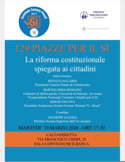 L’incontro è organizzato con il coinvolgimento della Camera Penale “Michelangelo Salerno” di Caltanissetta e dell’Unione delle Camere Penali Italiane e si propone come momento di approfondimento sui contenuti della riforma costituzionale.
