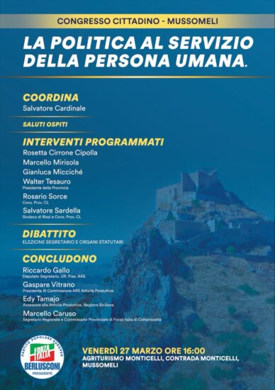 MUSSOMELI – Si svolgerà venerdì 27 marzo 2026, alle ore 16 presso l’Agriturismo Monticelli, il congresso cittadino di Forza Italia. Coordinerà l’incontro Salvatore Cardinale. Dopo il saluto agli ospiti, si alterneranno gli interventi programmati di Rosetta Cirrone Cipolla, Marcello Mirisola, Gianluca Miccichè, Walter Tesauro, Rosario Sorce, Salvatore Sardella. Seguirà il dibattito e l’elezione del Segretario e Organi statutari. Conjcluderanno i lavori, Riccardo Gallo deputato segretario uff. Presidenza ARS, Gaspare Vitrano Presidente III commissione ARS Attività Produttive, Edy Tamaio, Assessore regionale Attività Produttive e Marcello Caruso Segretario Regionale e Commissario Provinciale di Forza Italia di Caltanissetta.