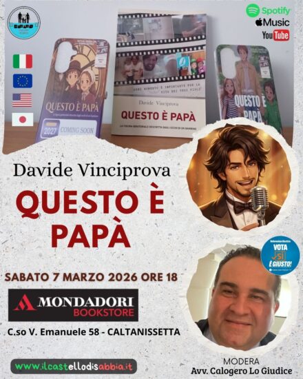 Sarà presentato sabato 7 marzo 2026 alle ore 18, nel cuore di Caltanissetta, il libro “Questo è papà” di Davide Vinciprova, Presidente del Movimento Centralità Familiare e Ambasciatore dell’uguaglianza genitoriale e della tutela delle relazioni familiari. L’appuntamento si terrà presso la Mondadori Bookstore – Corso Vittorio Emanuele 58, punto di riferimento culturale della città.