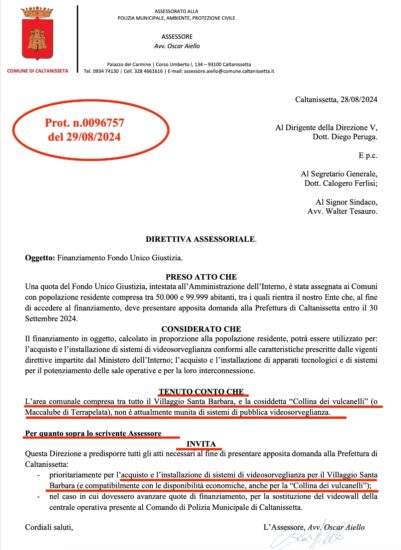Apprendo con grande soddisfazione dalla stampa locale la recente attivazione di 38 nuove telecamere di videosorveglianza nel Villaggio Santa Barbara. Questa importante dotazione tecnologica, che copre anche l’area dei cosiddetti Vulcanelli, rappresenta un traguardo storico e fondamentale per la sicurezza dei residenti e della nostra città. Ho tuttavia notato che, nei giorni scorsi, qualcuno ha tentato di attribuirsi pubblicamente i meriti di questo traguardo. Per amore della verità e nel profondo rispetto che nutro verso i cittadini nisseni, ritengo doveroso fare chiarezza basandomi esclusivamente su atti ufficiali e inconfutabili. L’installazione di questo impianto, finanziato dal Ministero dell’Interno, è infatti il risultato diretto, tangibile e documentato della Direttiva Assessoriale prot. n.0096757 da me emanata in data 29 Agosto 2024, durante il mio mandato di Assessore alla Polizia Municipale. Con quell’atto formale, ho dato indicazione di richiedere i fondi del “Fondo Unico Giustizia” per destinarli prioritariamente all’acquisto e all’installazione di sistemi di videosorveglianza per il Villaggio Santa Barbara e per la “Collina dei Vulcanelli”.