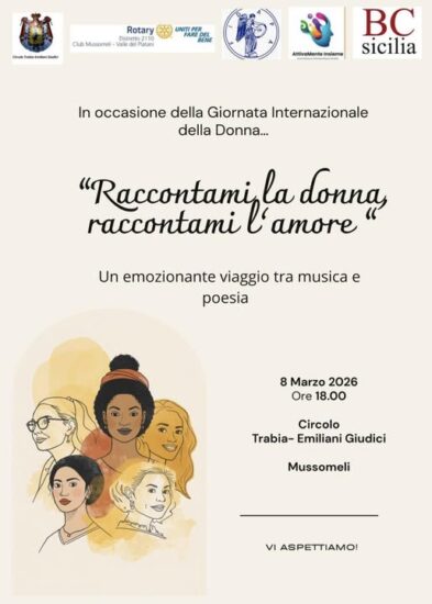 MUSSOMELI – In occasione della Giornata Internazionale della Donna, il circolo Trabia Emiliani Giudici e il Club Rotary Mussomeli Valle del Platani, in collaborazione con le associazioni Fidapa, Attivamente Insieme e BC Sicilia, hanno organizzato un evento tra musica, racconti e poesie per celebrare la donna. L’incontro è previsto per domani (8 marzo) presso la sede del Circolo Trabia, alle ore 18 , nella centralissima Piazza Roma.