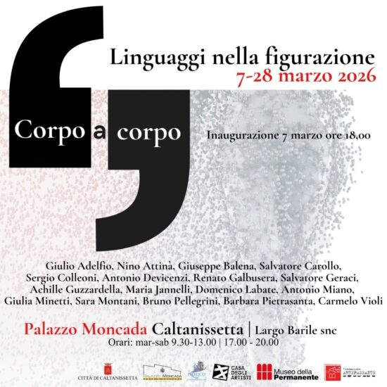 Sabato 7 marzo 2026, alle ore 18.00, negli spazi di Palazzo Moncada a Caltanissetta, sarà inaugurata la mostra “Corpo a Corpo – Linguaggi nella figurazione”, con opere di Giulio Adelfio, Nino Attinà, Giuseppe Balena, Salvatore Carollo, Sergio Colleoni, Antonio Devicenzi, Renato Galbusera, Salvatore Geraci, Achille Guzzardella, Maria Jannelli, Domenico Labate, Sara Montani, Antonio Miano, Bruno Pellegrini, Barbara Pietrasanta, Carmelo Violi. A cura di Luca Miccichè, Presidente Associazione Pro Loco Caltanissetta APS, l’artista Salvatore Carollo e La Casa degli Artisti. Saranno esposte trentadue opere, selezionate prevalentemente tra quelle realizzate negli ultimi anni, che restituiscono uno spaccato significativo delle ricerche più attuali di ciascun artista.La mostra rappresenta la quarta tappa del progetto espositivo Corpo a Corpo, dopo le precedenti esposizioni di Matera, Fanano e Milano.
