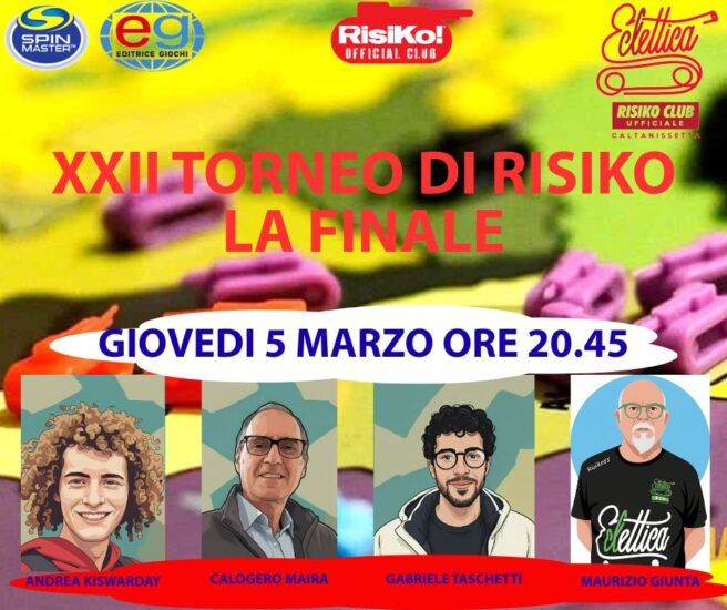 Giovedì 5 marzo alle ore 20,45 (start 21,00), presso Eclettica Street Factory, si giocherà la finale del XXII torneo interno (campionato periodico) valido per la classifica del Ranking Nazionale Live e del Ranking Interno. Il torneo, primo del 2026, ha visto, nei suoi sei turni di qualificazione, un raro equilibrio tra i partecipanti con una classifica che in ogni turno di gioco subiva cambiamenti radicali. Tutto ciò a dimostrazione di una maturazione di gioco e strategia da parte dei giocatori e delle giocatrici che si incontrano ogni giovedì sera da Eclettica per passare una serata in allegria e condividendo la passione per il gioco del Risiko!.