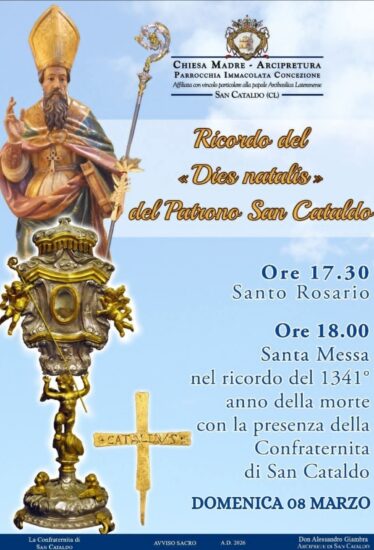 SAN CATALDO – La Città di San Cataldo, il prossimo 8 marzo, ricorderà il dies natalis di San Cataldo, nel 1341° anniversario della sua morte. Nella tradizione della Chiesa il “dies natalis” indica il giorno della nascita al cielo di un santo, momento che viene custodito come memoria viva della sua testimonianza di fede.