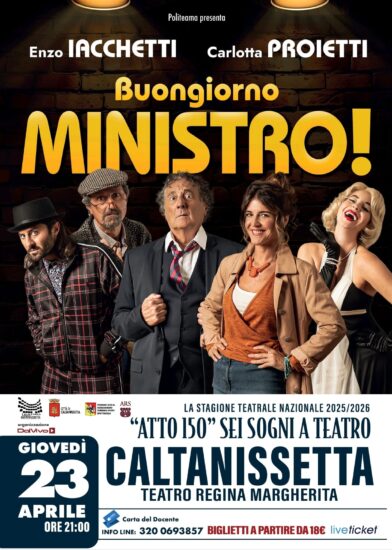 A chiudere il cartellone sarà lo spettacolo “Buongiorno Ministro!”, in programma 23 aprile 2026, che vedrà protagonisti Enzo Iacchetti e Carlotta Proietti, due mattatori irresistibili capaci di trascinare il pubblico in una sequenza serrata di gag e battute pirotecniche.