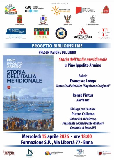 Enna si prepara ad accogliere due importanti appuntamenti culturali promossi nell’ambito del Progetto Biblioinsieme, il progetto promosso dal Comitato di Enna della Società Dante Alighieri, in collaborazione con i Comuni di Enna, Aidone, Calascibetta e Villarosa, e con il coinvolgimento di numerose realtà del terzo settore. Il progetto è sostenuto dalla Fondazione Con il Sud e dal Centro per il libro e la lettura del Ministero della Cultura. Il primo incontro si terrà mercoledì 15 aprile 2026 alle ore 18:00, presso Formazione S.P., in via Libertà 77 a Enna, e sarà dedicato alla presentazione del volume “Storia dell’Italia meridionale” di Pino Ippolito Armino.