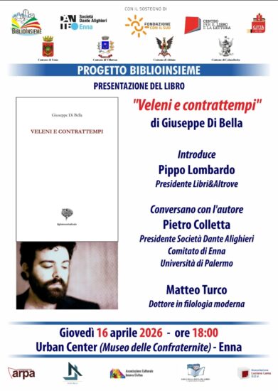 A introdurre sarà Pippo Lombardo, presidente di Libri&Altrove. Converseranno con l’autore Pietro Colletta, presidente della Società Dante Alighieri – Comitato di Enna e docente dell’Università di Palermo, e Matteo Turco, dottore in filologia moderna. “Veleni e contrattempi”, seconda silloge poetica di Giuseppe Di Bella, è un libro attraversato dai temi della luce e dell’ombra, della tensione amorosa e del paesaggio siciliano, in una scrittura densa e fortemente musicale. Giuseppe Di Bella, compositore, cantautore e poeta siciliano nato a Enna, ha realizzato diversi lavori discografici, alcuni dei quali finalisti a premi nazionali come il Tenco e il Parodi. In ambito letterario ha collaborato con la casa editrice con-fine, ha co-diretto con Alex Caselli una collana di poesia e ha pubblicato, tra l’altro, “Le gradazioni del bianco” e il libro-cd “Fuddìa”. Ingresso libero in entrambe le iniziative.