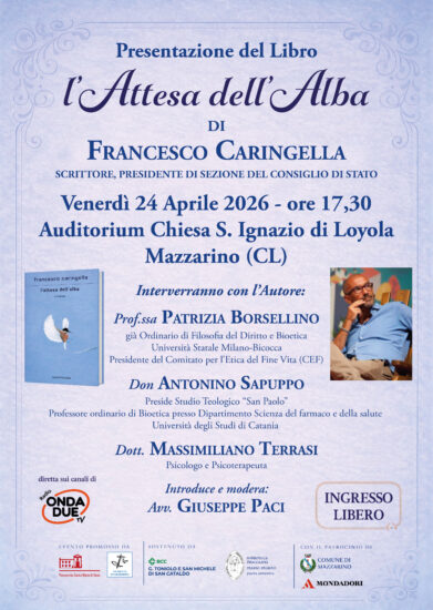 Si terrà venerdì, 24 aprile, alle ore 17:30, all’auditorium della chiesa S. Ignazio di Loyola, a Mazzarino, in provincia di Caltanissetta, la presentazione – la prima in Sicilia – del libro “L’attesa dell’alba” di Francesco Caringella, scrittore e Presidente della quinta sezione del Consiglio di Stato.