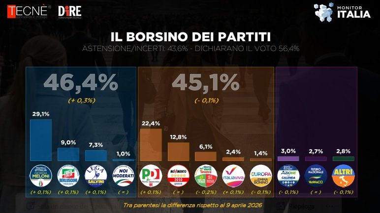 Il centrodestra resta avanti con il 46,4% delle preferenze, lo 0,3% in più rispetto al 9 aprile. Il campo largo si attesta al 45,1% e perde lo 0,1%. Questo il quadro del sondaggio realizzato da Tecnè per l’agenzia Dire con interviste effettuate tra il 22 e il 24 aprile.