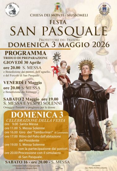 MUSSOMELI – Sembra essere ormai consolidata la tradizione di riservare la prima domenica di maggio, quest’anno giorno 3, alla festa di San Pasquale, protettore dei pastori, che si venera nella chiesa di S. Gioacchino e S. Anna detta dei “Monti”, la cui giornata liturgica, in calendario, è segnata il 17 maggio. E così, giovedì 30 aprile sera, alle ore 20, con la celebrazione della messa, benedizione dei pastori e del fercolo di San Pasquale, inizia il triduo di preparazione; il venerdì, alle ore 20, messa e benedizione dei formaggi; sabato, alle ore 19, messa, Vespri solenni, omaggio floreale e preghiera per le donne; domenica, messa alle 9 e alle 11; ore 16, giro dei tamburinari di Cammarata; ore 17 ritiro del Palio dall’abitazione del presidente; ore 19, messa solenne con la partecipazione dei pastori; ore 20 Processione col simulacro del Santo.