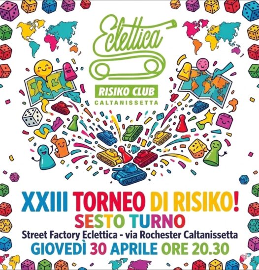 Tutto il Club è in festa per l’affermazione di domenica di Giulia Gulino, Andrea Kiswarday e Gabriele Taschetti. Infatti domenica 26 al I° Master nazionale “Città di Catania”, a cui hanno partecipato 100 tra giocatori e giocatrici provenienti da tutta la Sicilia e buona parte dal territorio nazionale, i tre soci e giocatori del Club nisseno hanno letteralmente sbaragliato il campo riuscendo a ottenere il migliore risultato possibile: due primi posti, Giulia Gulino e Andrea Kiswarday, un secondo posto Gabriele Taschetti. I commentatori dell’evento, ricordiamo che il Master è stato ripreso da “Risiko Show” (per chi volesse può rivedere le due partite della finale su You Tube), nonostante riprendano tutte le finali degli eventi a caratura nazionale, hanno messo in risalto il fatto che tre finalisti fossero dello stesso Club e che due di loro avevano conquistato i primi posti, questo per evidenziare che succede di rado. Intanto il Risiko Club nisseno si prepara ad organizzare la propria presenza alla 3a edizione della “Festa della Primavera” che si terrà, come ogni anno, alla Villa Amedeo dal 15 al 17 maggio. “Anche quest’anno saremo presenti con un nostro gazebo, tavoli, sedie e con le nostre scatole a diffondere e promuovere il gioco del Risiko! , si terrà il II° ” Memorial Manliopasqua” per ricordare Manlio Pasqualino, presidente del Club di Risiko Eclettica, scomparso prematuramente l’anno scorso. Abbiamo conferma della presenza dei Risiko Club di Catania e Palermo e di altri giocatori siciliano di spessore. Sarà una giornata di festa, nel ricordo di Manlio, socio fondatore del Club, che tanto ha dato per il gioco del Risiko! e per il Club Eclettica”.